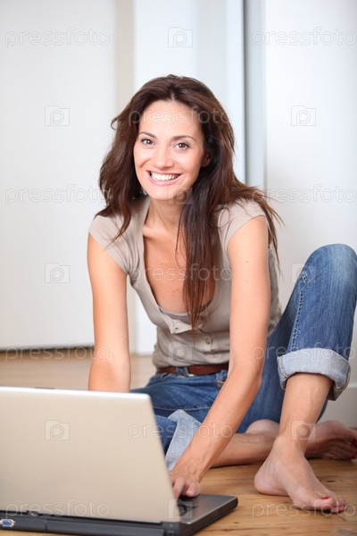 Женщина, сидя на полу дома с ноутбуком