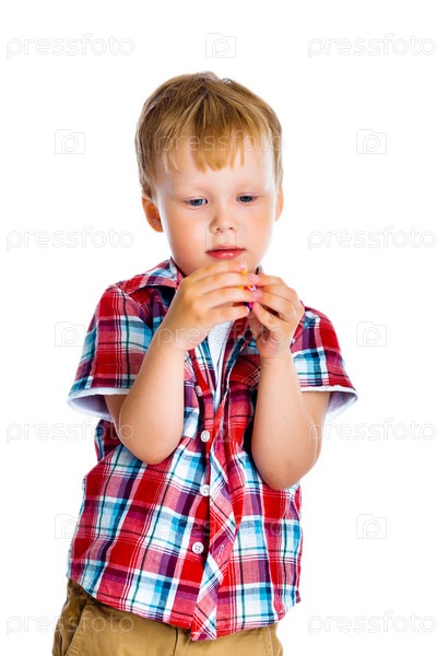 Маленький мальчик стоит и рассматривает маленькая игрушка