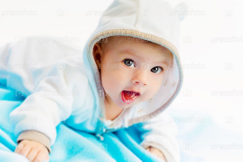 Красивый младенец лежал на голубой плед