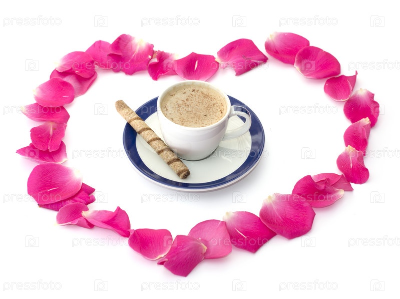 Кружку капучино в среде лепестков роз
