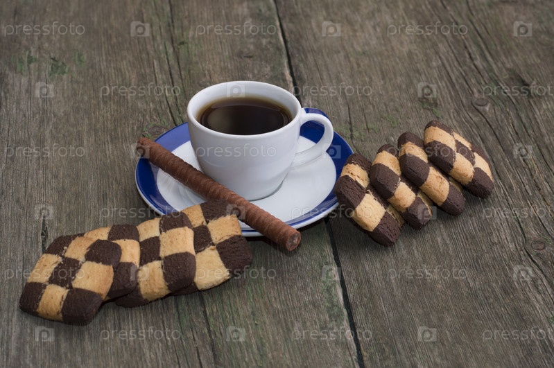 Черный кофе в блюдце с синей границей и клетчатые печенье