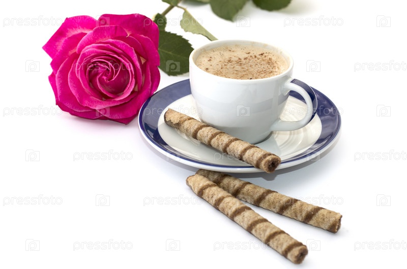 Роуз и капучино на блюдце с синей границей