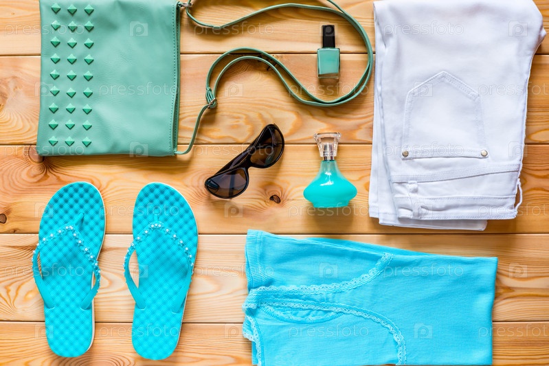 Одежда и обувь бирюзового цвета на фоне деревянные