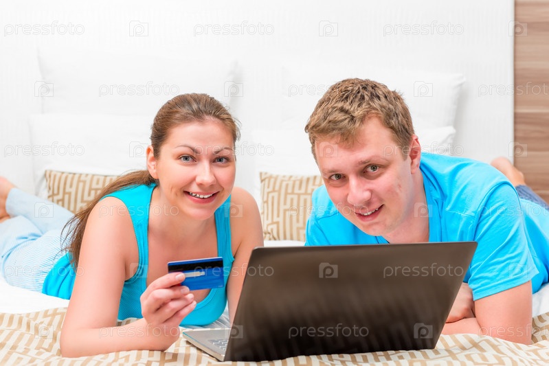 Муж и жена с кредитной карты и ноутбук на кровати в спальне