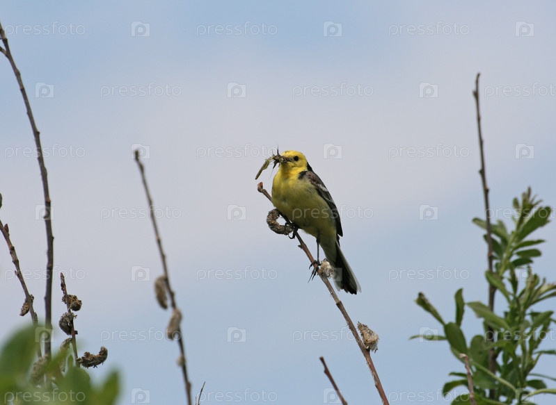 Желтоголовая трясогузка с пищей в клюве