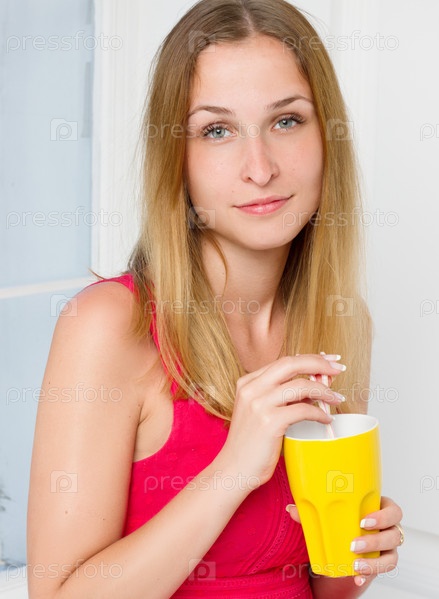 Повседневный стиль молодая женщина позирует Держите стакан воды
