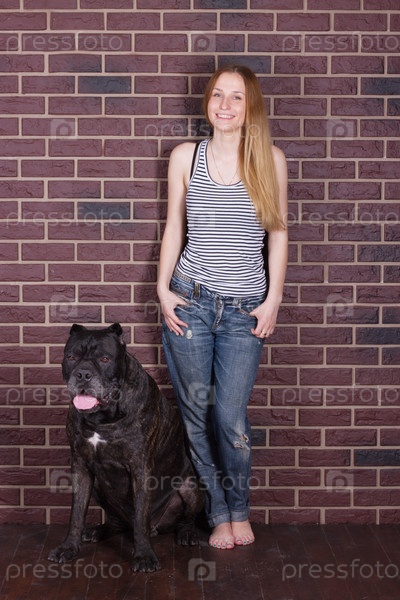 Девушка в джинсах и рубашке стоя, обнимая большая собака
