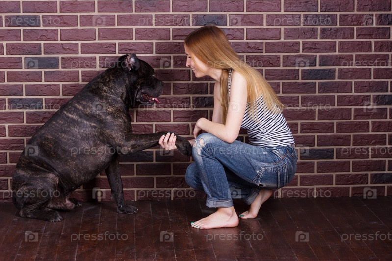 Девушка в джинсах и футболке Кане Корсо собака узнает команды Дай лапу