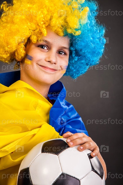 Футбольный болельщик с украинским флагом на черном фоне