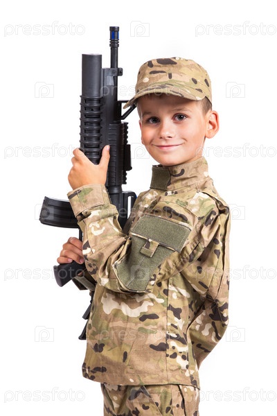 Молодой мальчик, одетый как солдат с винтовкой