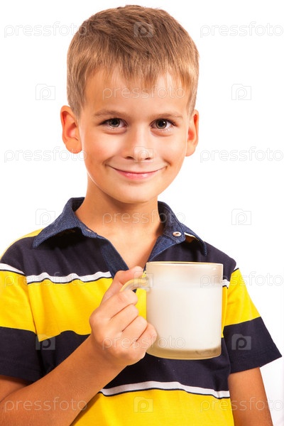 Симпатичный мальчик пьет молоко на белом