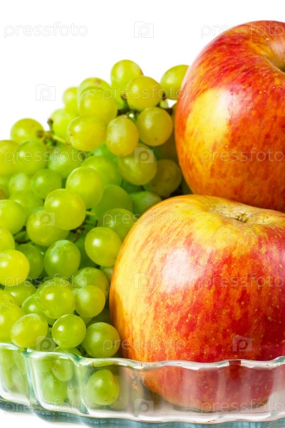 Яблоки и зеленый виноград на белом фоне