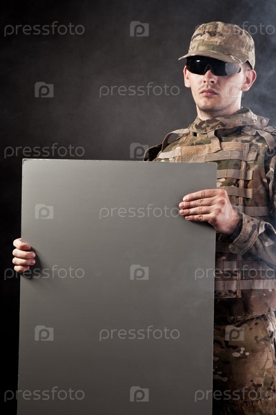 Современные солдат держит плакат