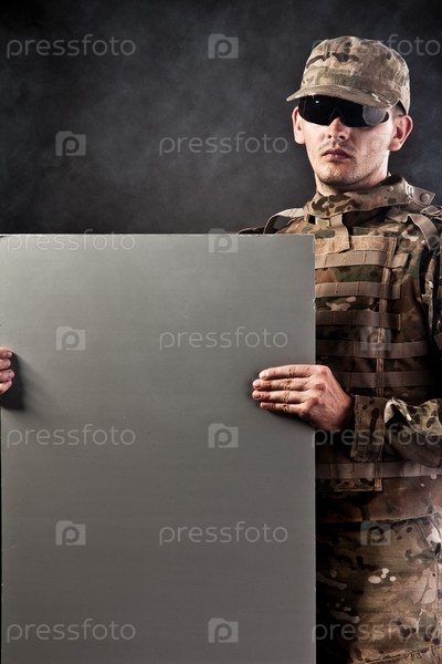 Современные солдат держит плакат