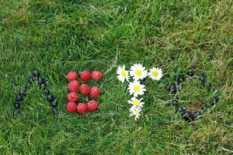 Спелые ягоды и ромашки образуют слово "Лето" на траве