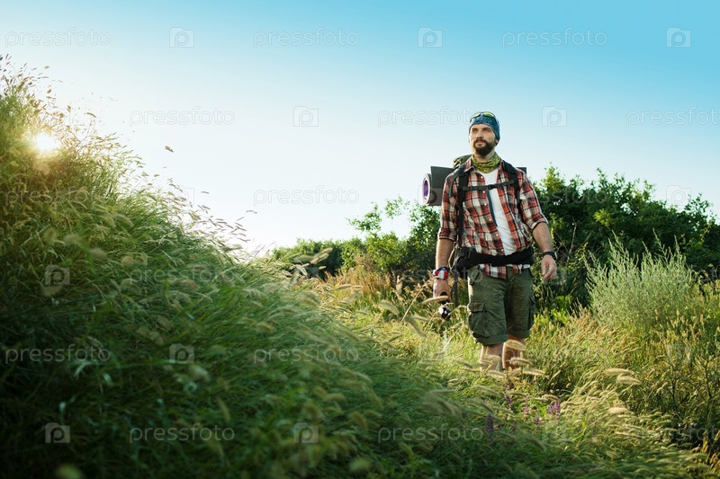 Молодой человек с рюкзаком,на вершине холма