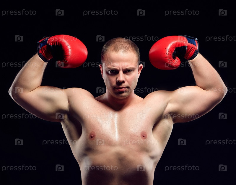 Молодой сильный боксер в красных перчатках