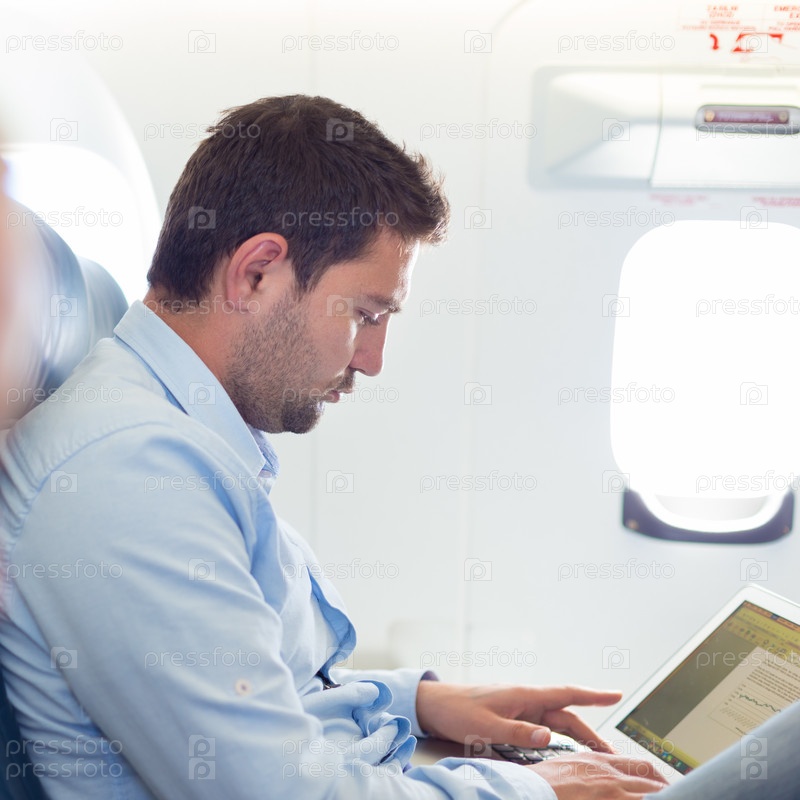 Бизнесмен, работы с ноутбуком на самолете