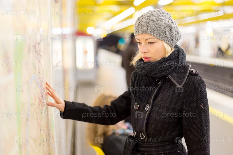Леди, глядя на общественный транспорт карта панели