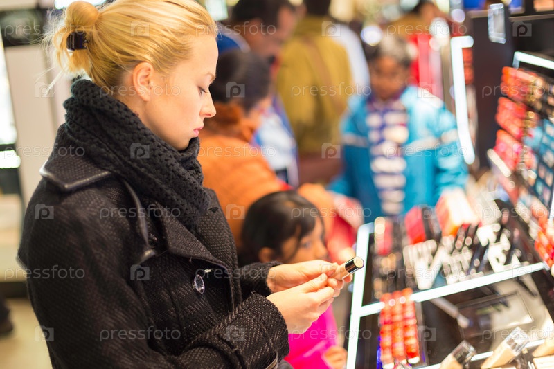 Красивая блондинка леди тестирование и покупка в магазине красота Косметика