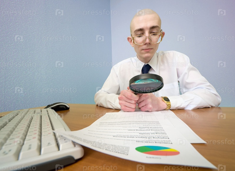 Босс с лупой в руке на рабочем месте