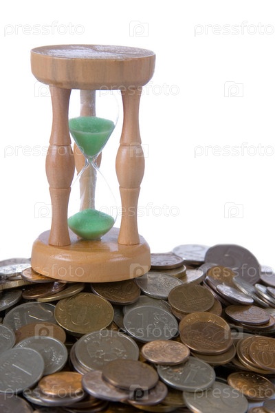 Монеты и песочные часы крупным планом