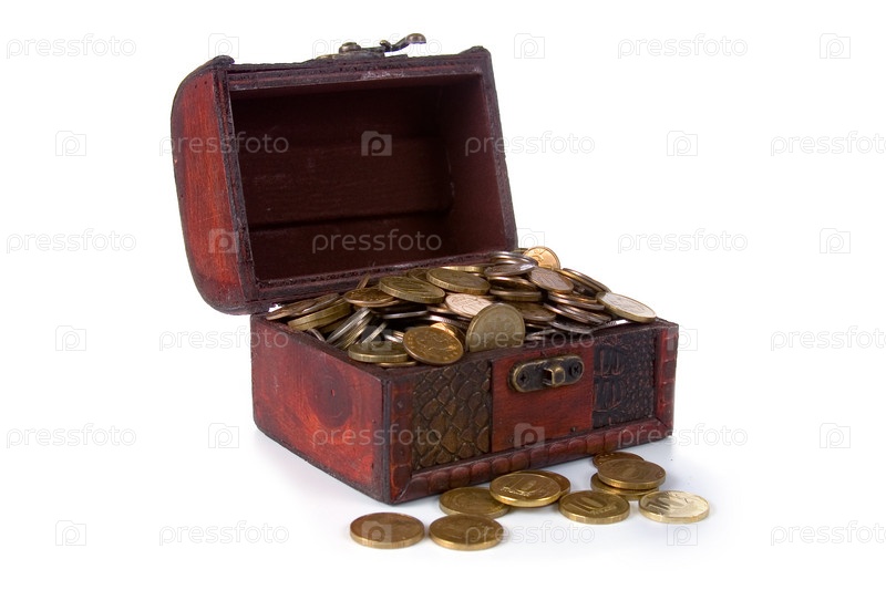 Монеты в сундуке на белом фоне