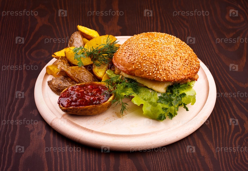 Гамбургер на деревянной доске