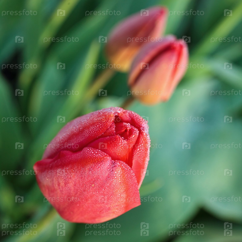 Красные тюльпаны с каплями росы