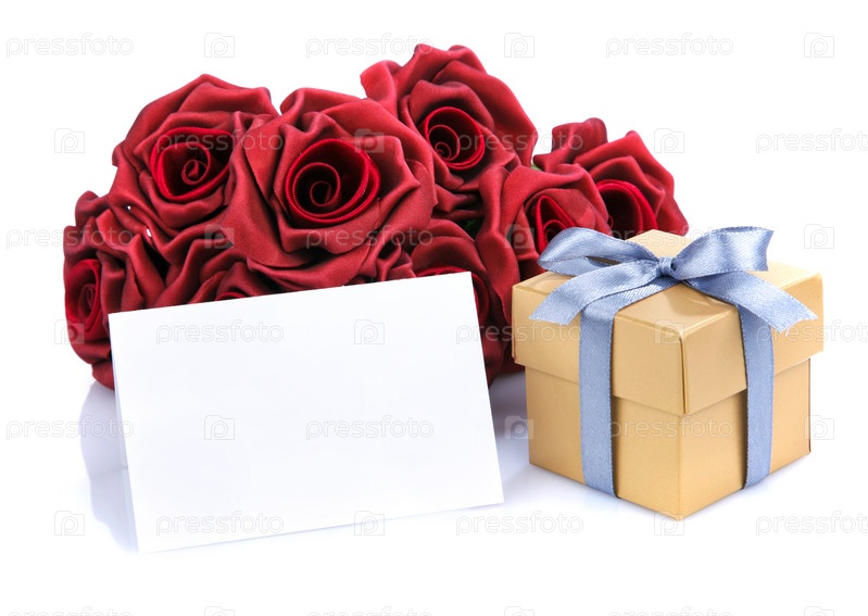 Открытка с красными цветами и подарочной коробке