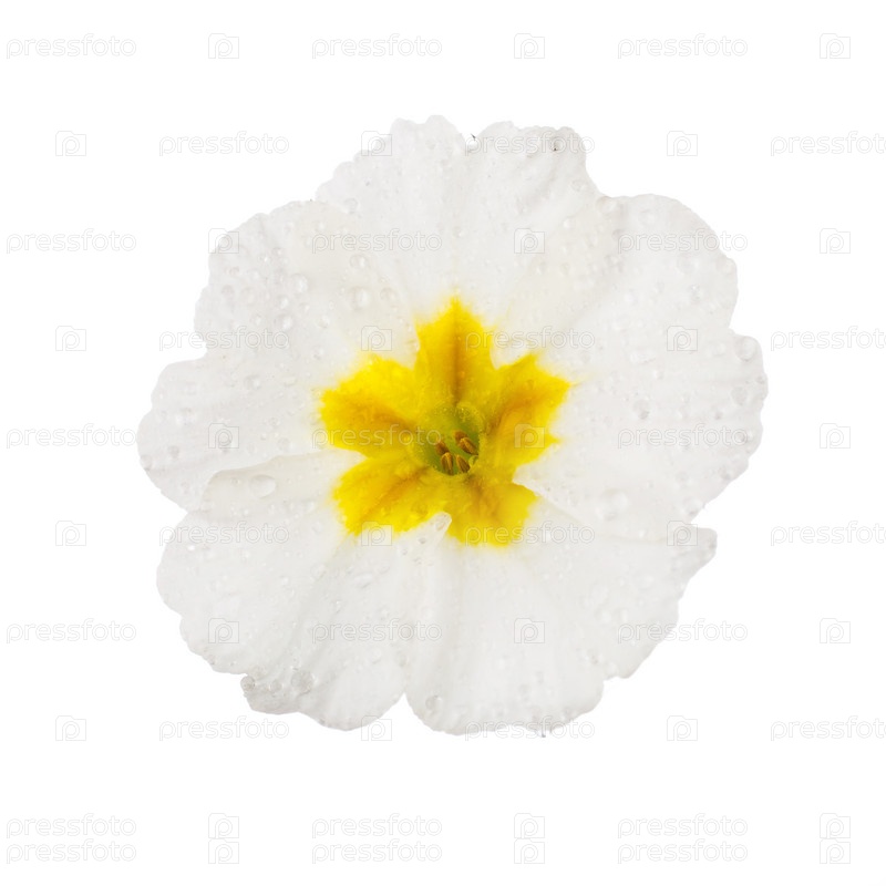 Белая примула с каплями росы