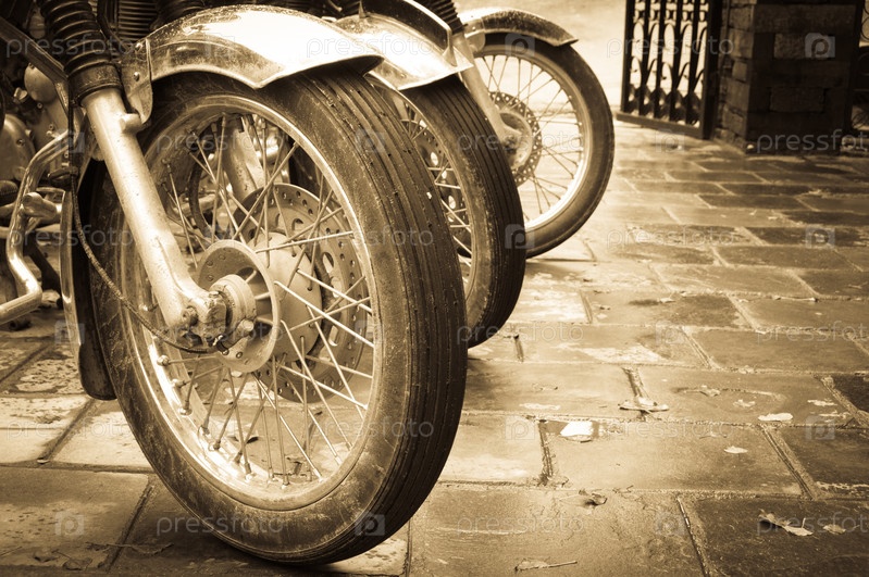 Мотоциклы, стоящие в ряд, сепия