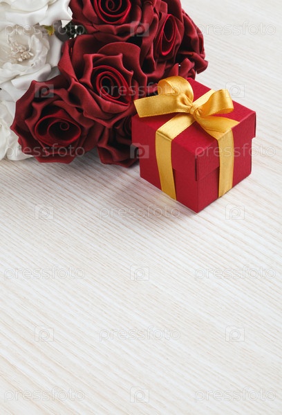 Красные цветы и подарок коробку с желтой лентой