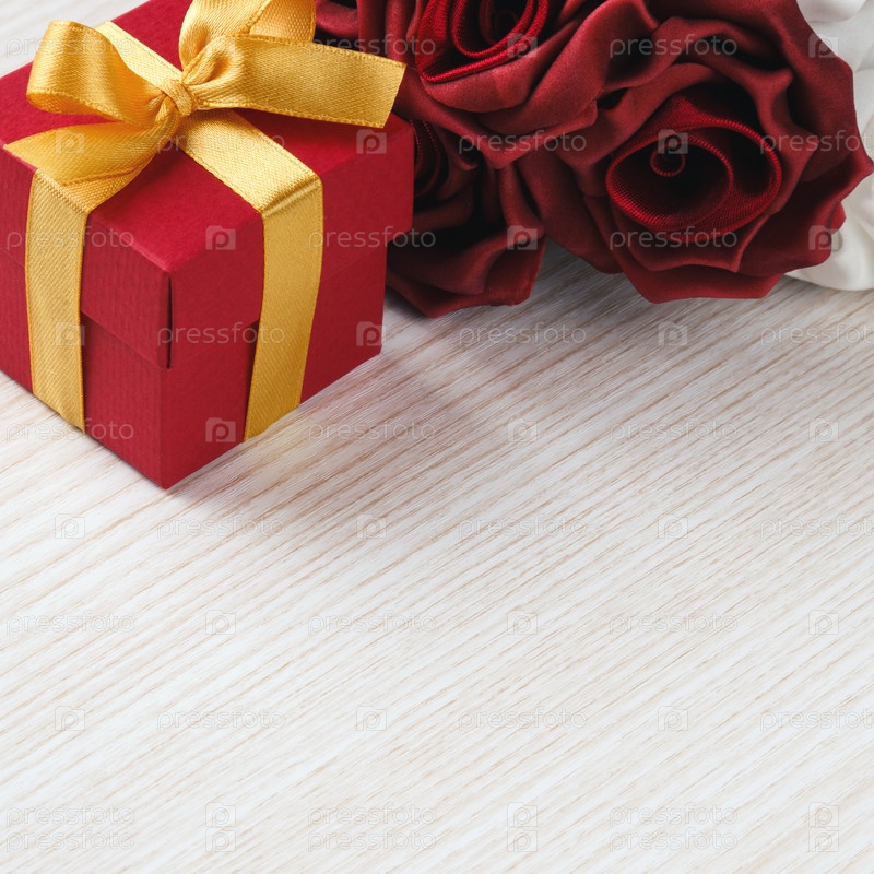 Красные цветы и подарок коробку с желтой лентой