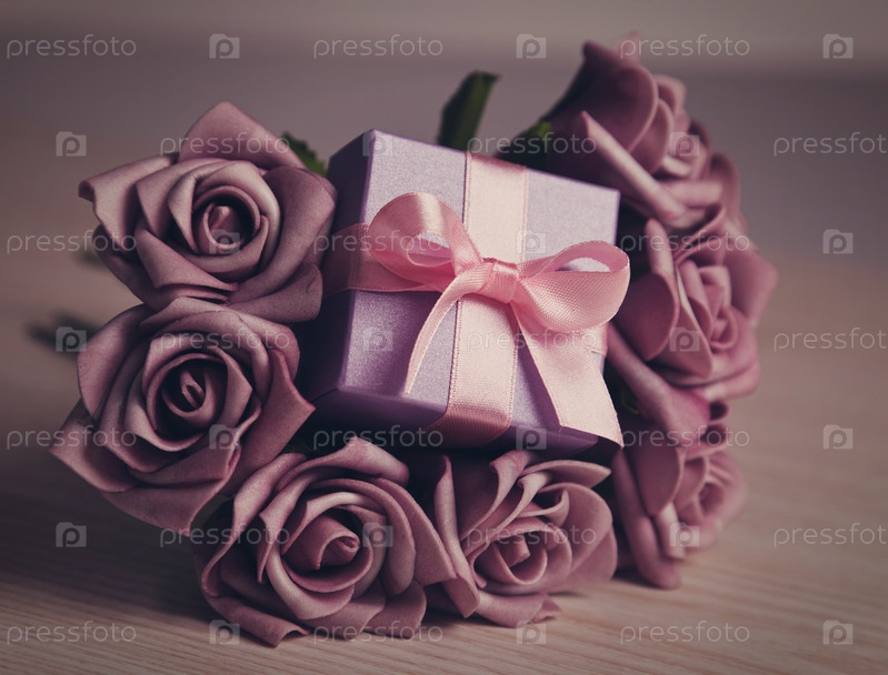 Фиолетовые розы и коробка подарка