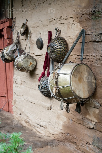 Старые традиционные индийские барабаны на деревянной стене