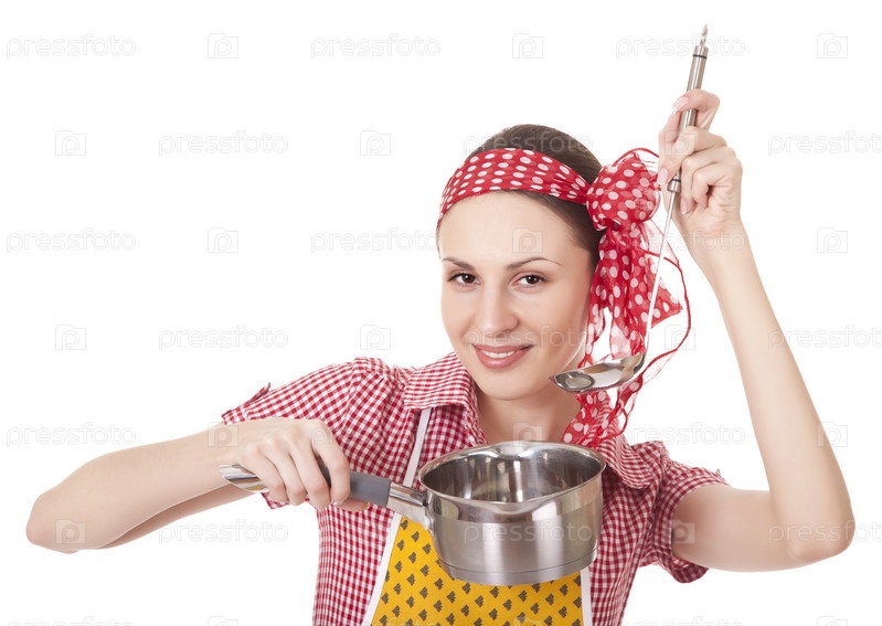 Домохозяйка с половником и кастрюлей на белом фоне