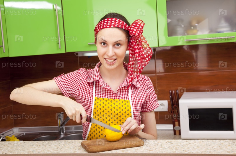 Домохозяйка режет лимон на кухне