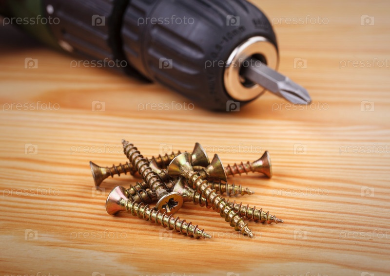 Дрель и больших винтов на фоне дерева