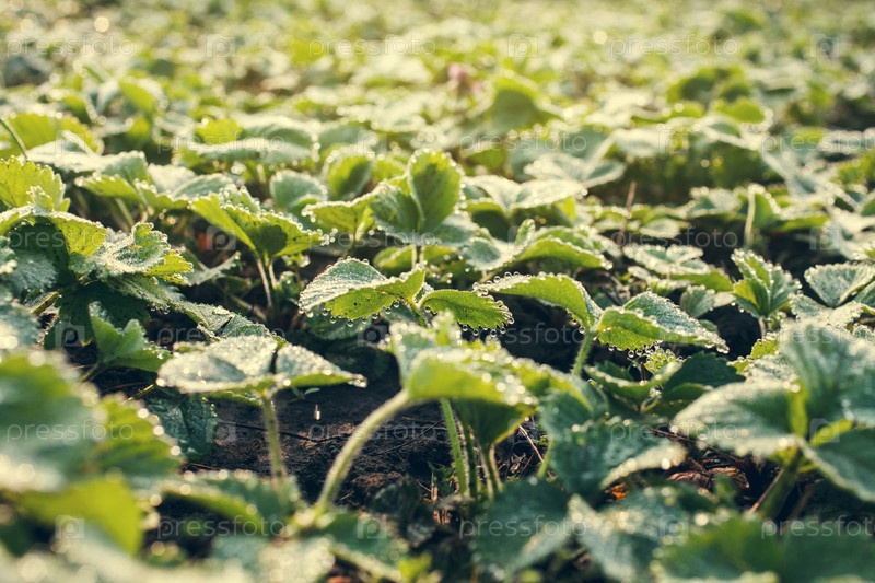 Капли росы на листья клубники
