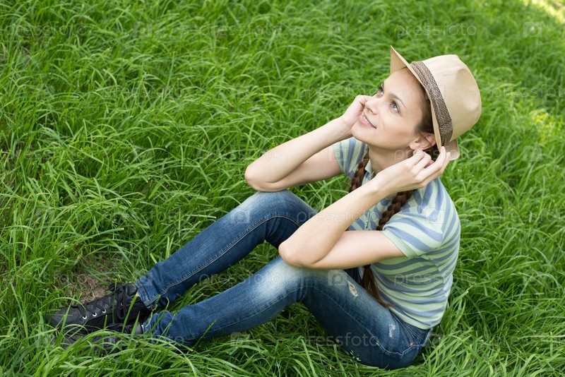 Девушка, расслабляясь в газон