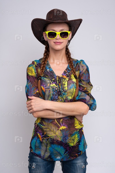 Женщину носить солнцезащитные очки и ковбойской шляпе