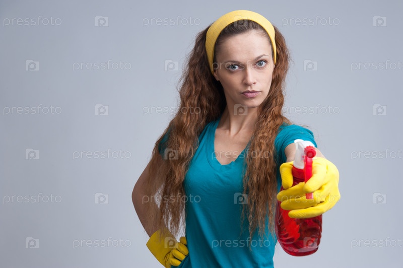 Женщина, опрыскивание с чистящей жидкостью