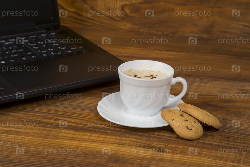 Компьютер и чашку кофе и печенье