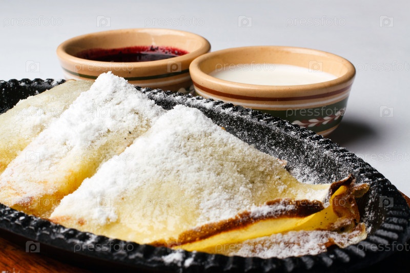 Блины со сметаной и вишневым вареньем