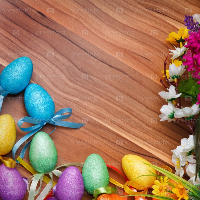 Пасхальная композиция и красочные яйца на деревянные поверхности