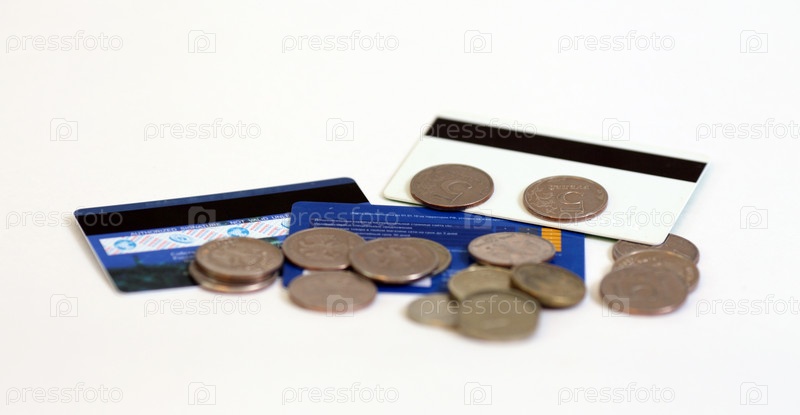 Банковские карточки и монеты на белом фоне