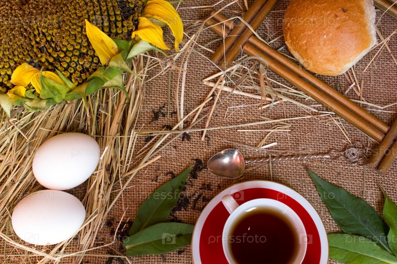 Колосья пшеницы, чай, чашки, подсолнечника, яйца и хлеб на мешковины