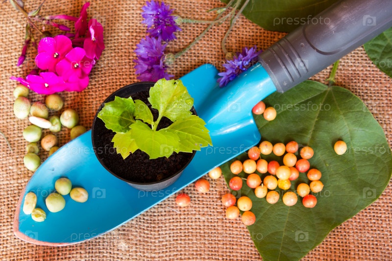 Садовничая совок на фоне мешковины с почвы и растений, горшок, вид сверху