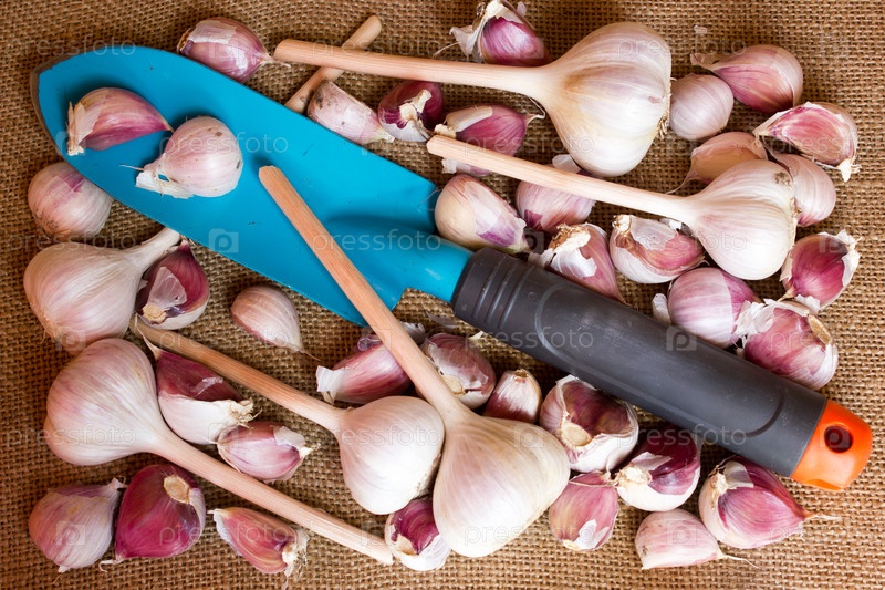 Белый чеснок луковицы и гвоздики, садоводства совок на мешковины